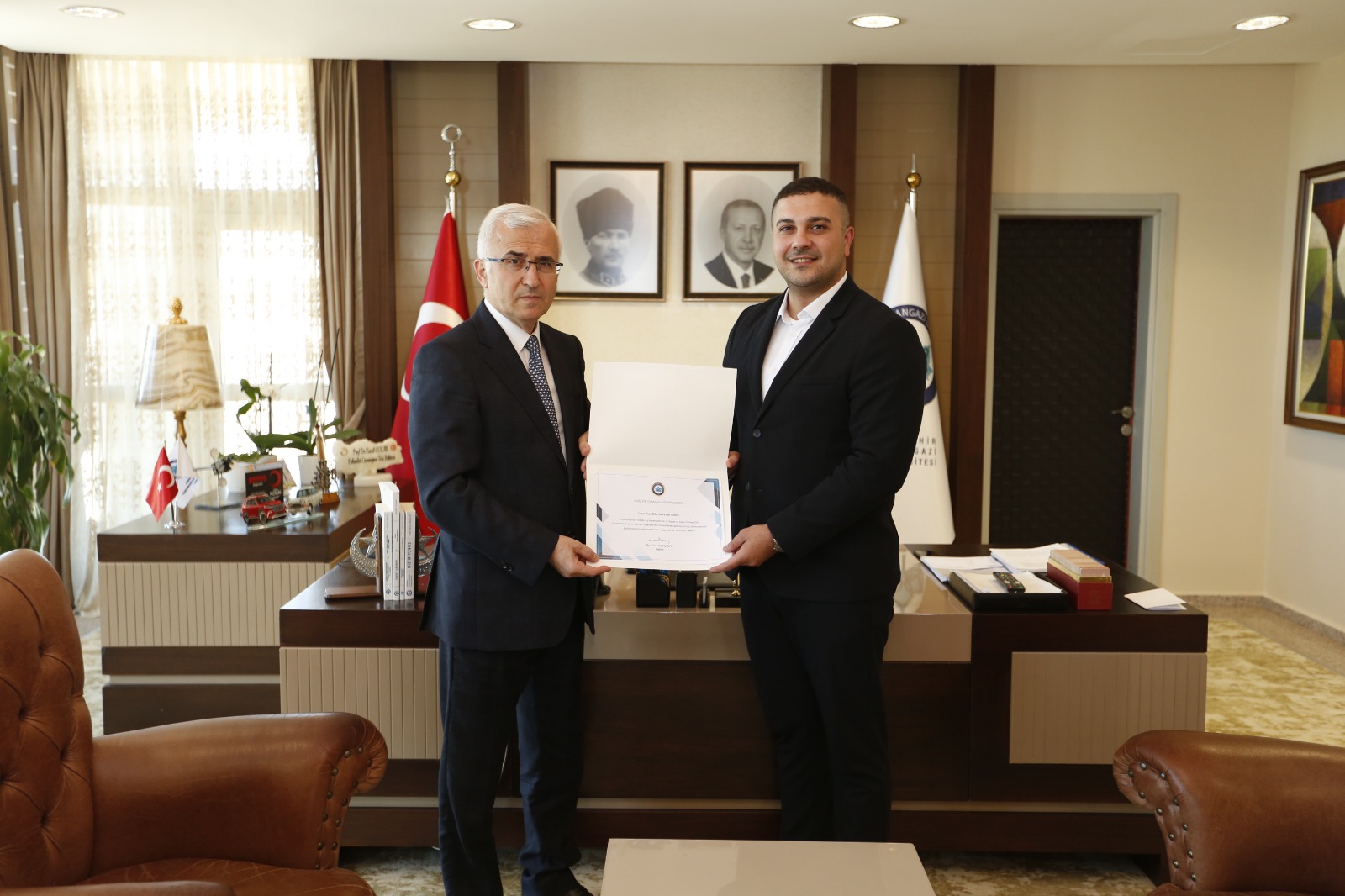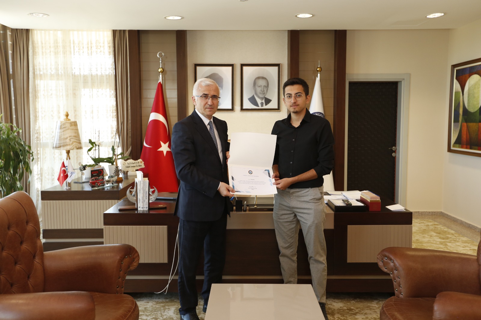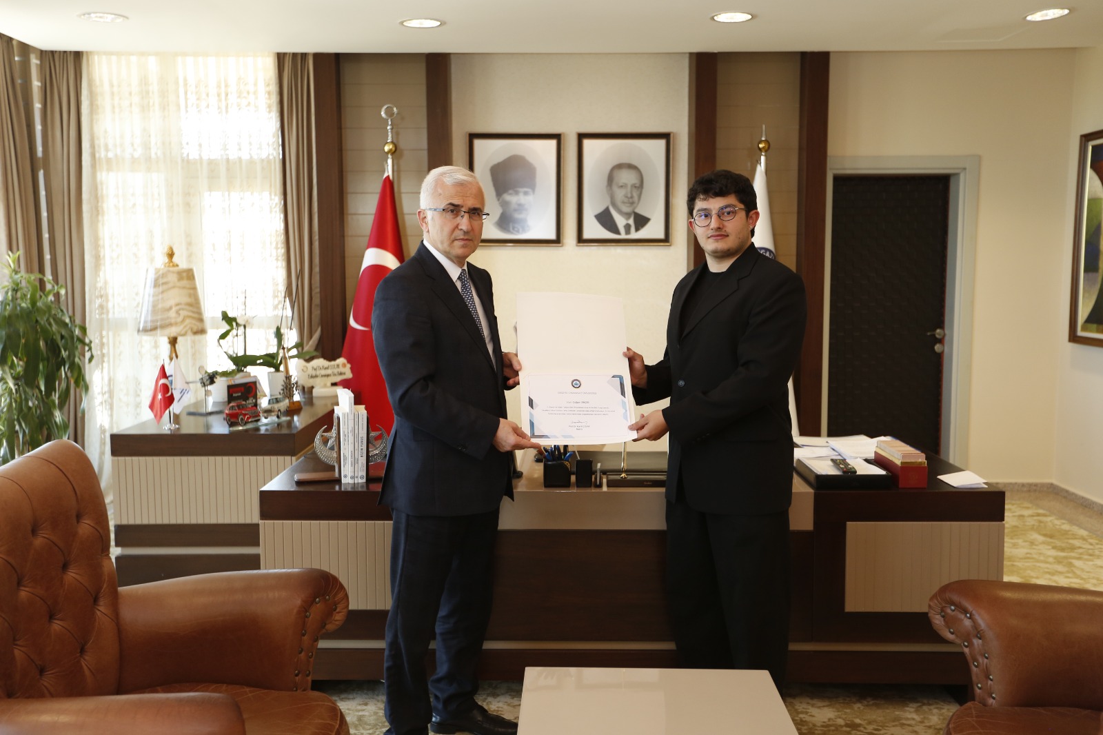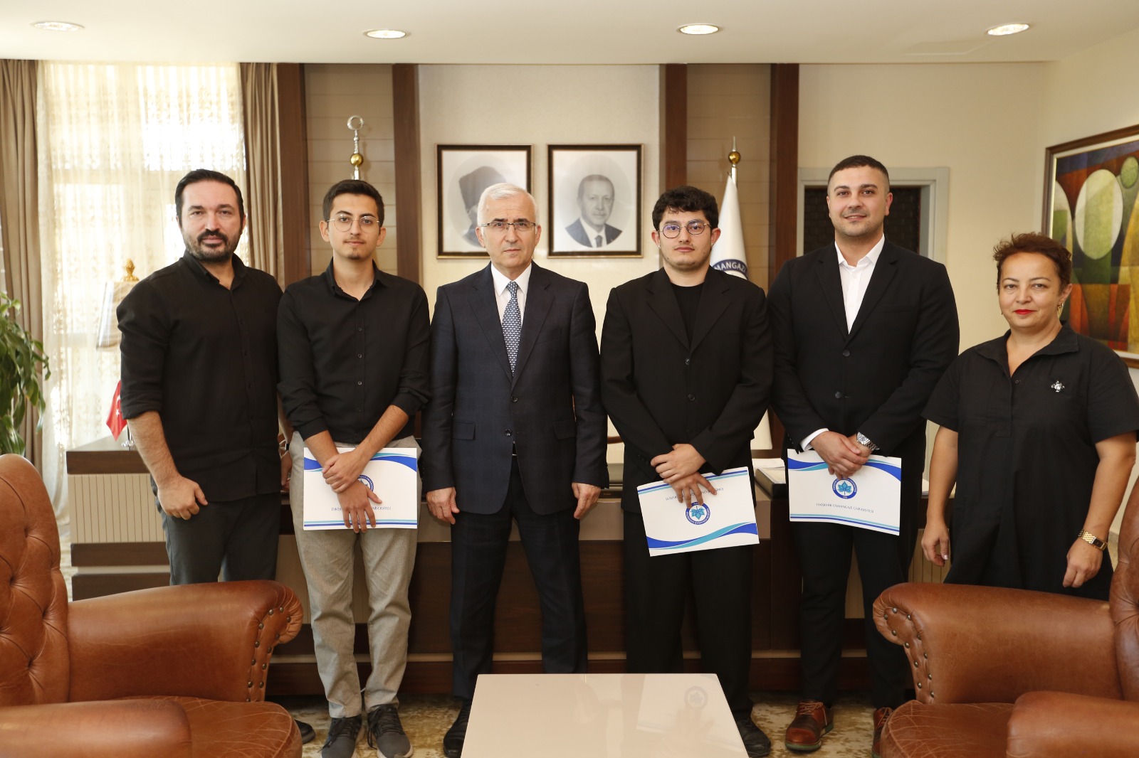 Eskişehir Osmangazi Üniversitesi Rektörümüz Sayın Prof. Dr. Kamil Çolak, projeleriyle ödül kazanan Barış Efe ve Çağan Dinçer'in yanısıra akademik danışmanları Araş. Gör. Mehmet Anaç'ı makamlarına kabul etti. Sanat Ve Tasarım Fakültesi Dekanı Prof. Dr. Şirin Şengel ve Endüstriyel Tasarım Bölüm Başkanı Doç. Dr. Cemil Yavuz'un eşlik ettiği makam kabulünde, öğrencilere ve danışmanlarına projeler hakkında genel sorular sorarak bilgi alan üniversite rektörümüz Sayın Prof. Dr. Kamil Çolak öğrencilere ve danışmanlarına teşekkür belgesi ve hediyeler vererek ödüllendirdi.