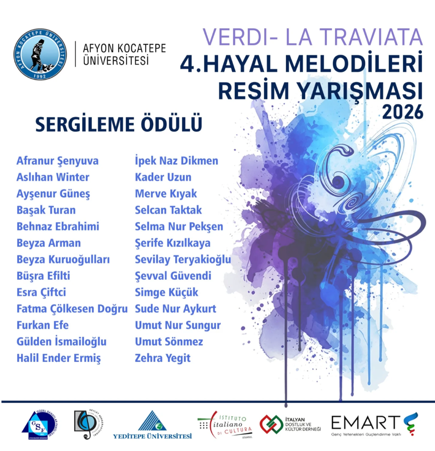 Sanat ve Tasarım Fakültesi, Görsel Sanatlar Bölümü öğrencimiz İpek Naz Dikmen, Sospeso adlı eseriyle 4. Hayal Melodileri Resim Yarışması’nda sergileme ödülüne layık görülmüştür.